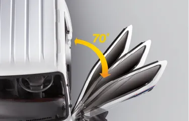 Hyundai Mighty W750 nổi bật với thiết kế ngoại thất mang phong cách mạnh mẽ, đem đến sự tiện nghi, linh hoạt trong quá trình vận hành. Cửa xe mở rộng 700mm giúp tài xế ra vào xe dễ dàng; gương chiếu hậu cung cấp tầm nhìn rộng; đèn pha với chóa phản quang tăng cường khả năng chiếu sáng tối ưu. Bậc lên xuống tiện lợi giúp việc lên xuống xe dễ dàng hơn. Những tính năng này góp phần giúp hành trình của các bác tài thêm phần an toàn, thoải mái, tiện nghi.